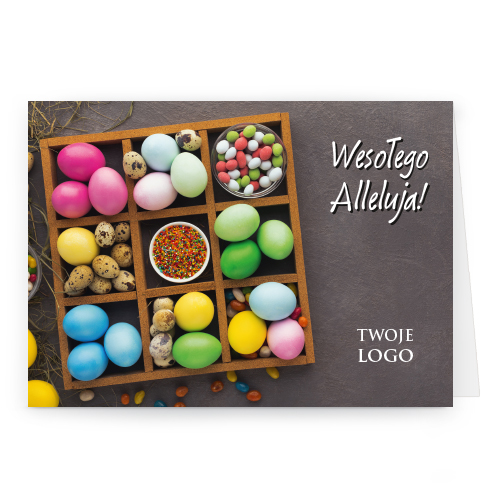 wzór: poziom_71 SPECYFIKACJA: Logo i życzenia są drukowane bezpośrednio na kartce. Do każdej kartki dołączona jest biała koperta C6. Istnieje możliwość zmiany haseł na froncie na dowolnie podaną wersję językową. |
